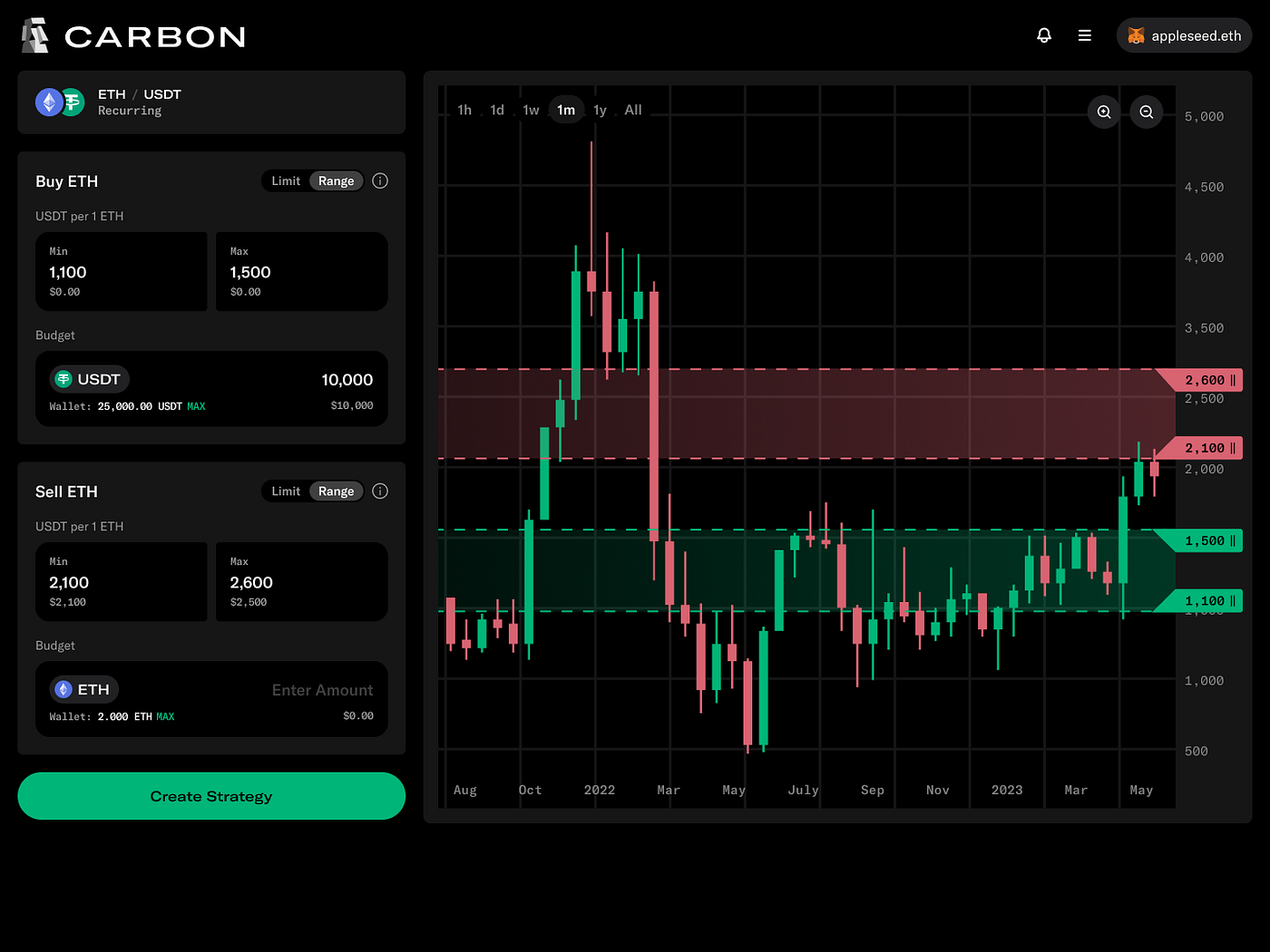 However, Carbon DeFi is unique in that each individual maker can customize the fee they collect from trades - i.e., the difference between their selected buy and sell ranges. While legacy AMMs force their liquidity providers to adopt the fee of the AMM they're providing liquidity to, Carbon DeFi lets LPs set their own personalized fee (or spread) by selecting the specific price(s) where they'd like to buy and sell their tokens.